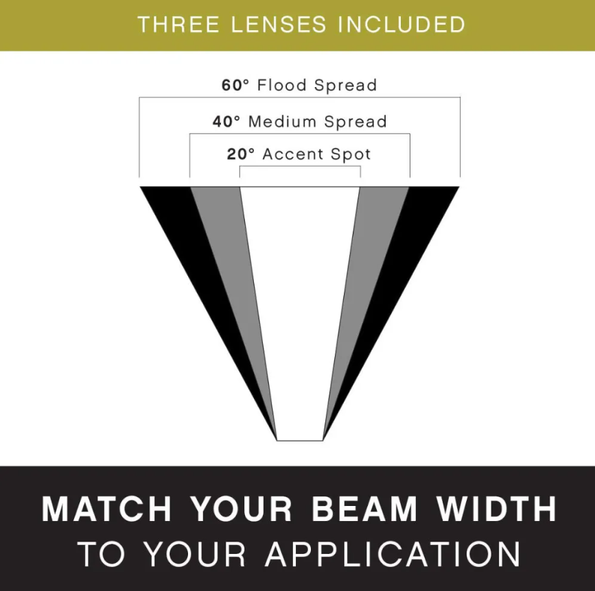 - Three lens options offer versatility in beam spread via an easy to remove and insert assembly - includes: 20° Spot, 40° Flood, 60° Flood